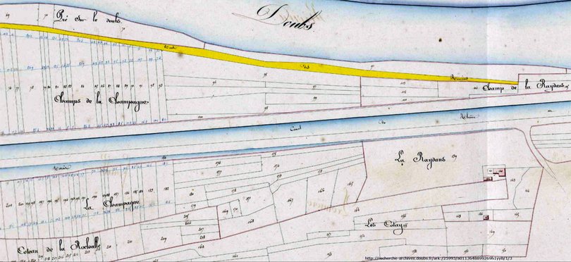 Appelée Route des Romains ou Chaussée de Jules César, la voie figure encore sur les plans napoléoniens (1835). Elle s’interrompt à hauteur de la rue des carrières pour reprendre, de l’autre côté du canal, à hauteur de l’écluse située un peu plus loin.