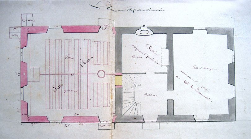Dès 1847, il estime la « maison d’école » insuffisante pour les besoins de l’époque. Il décide donc d’agrandir le bâtiment de façon à disposer d’une salle de classe avec deux issues permettant « à chaque sexe d’accéder séparément » (sur le plan suivant, on note une séparation entre les parties réservées, l’une aux garçons et l’autre aux filles).