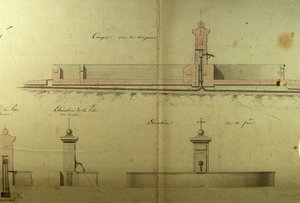 Des plans et dessins de 1828 concernent la construction d’un nouvel édifice. Ils permettent de dire que c’est à partir de cette date que cet ensemble a pris l’aspect qu’il a conservé jusqu’à une date récente, avant la destruction de deux de ses bassins. Il se composait d’un vaste abreuvoir (celui qui existe encore aujourd’hui) ainsi que de deux bacs : un grand pour le lavage des habits et un plus petit pour leur rinçage.