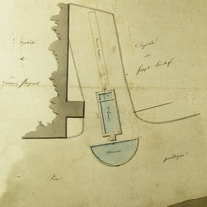 Avant 1789, il n’y avait qu’une seule fontaine, à proximité de celle qui se trouve aujourd’hui encore sur la place de la Résistance, au centre du bourg. Son existence est attestée dans un texte datant du milieu du XVIIIème siècle. Située légèrement en arrière de l’installation actuelle, elle ne comprenait alors que des bassins sommairement aménagés comme l’indique le plan ci-contre. De cet ensemble, il ne reste aucune trace.